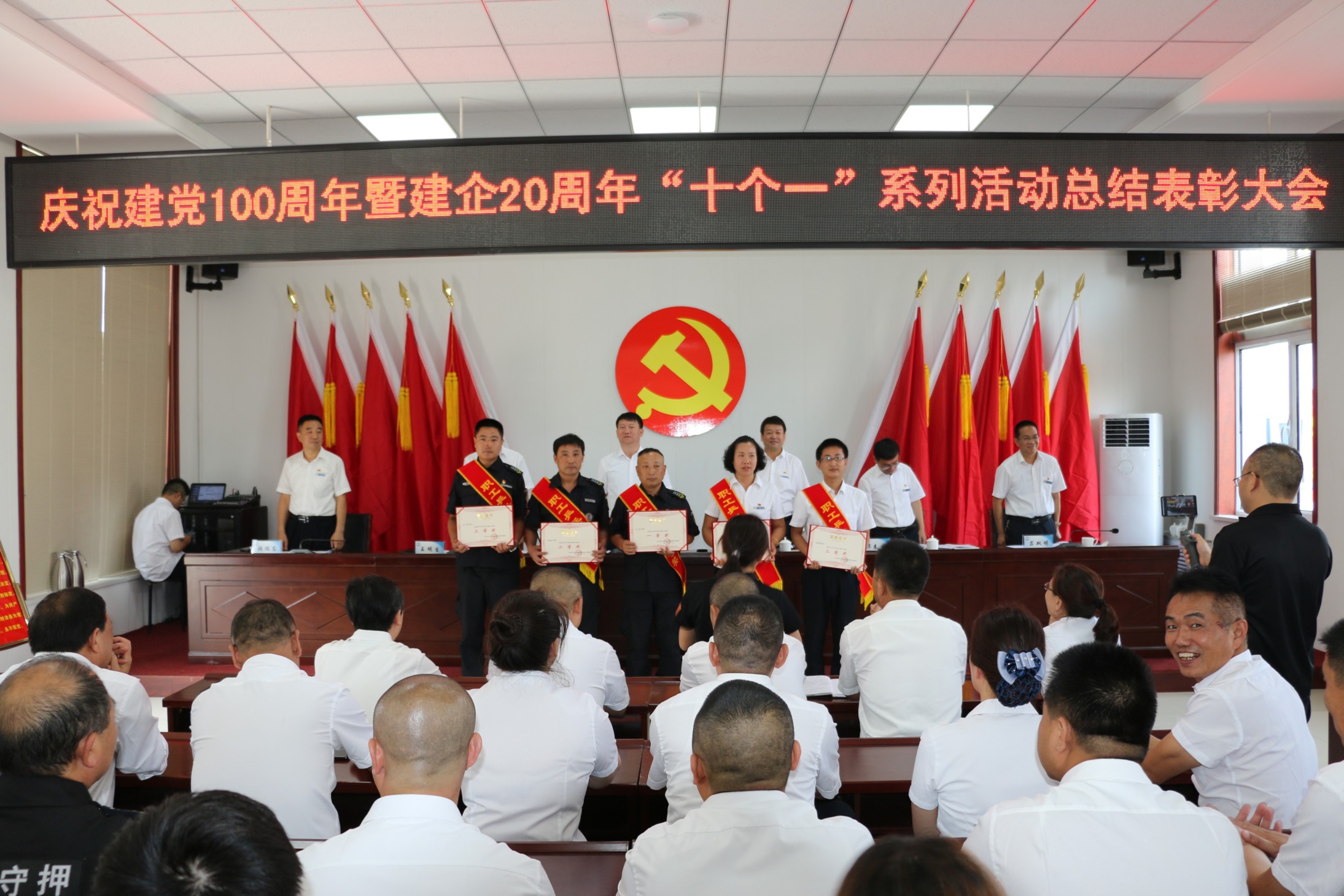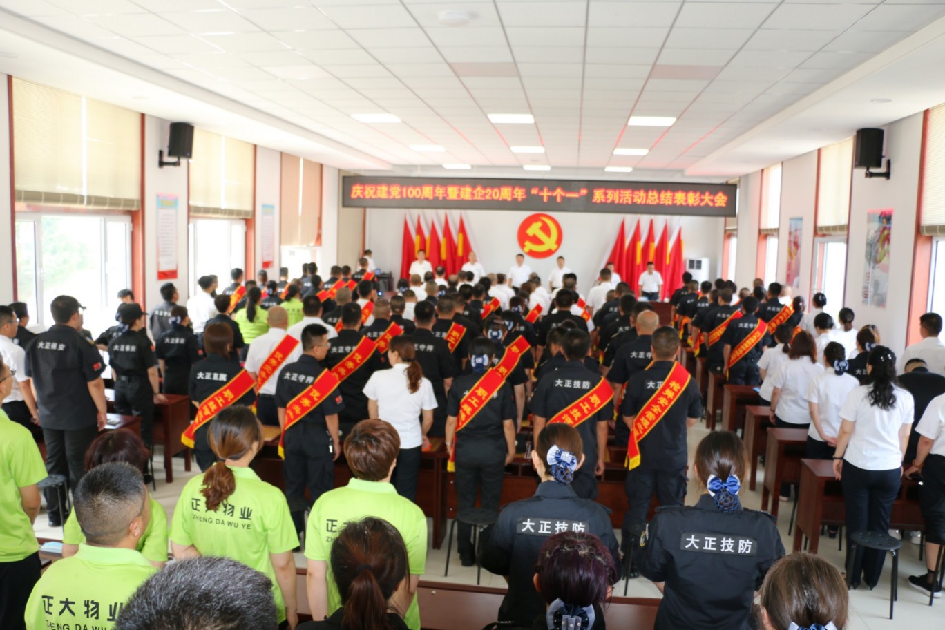 為熱烈慶祝中國共產(chǎn)黨成立100周年,頌揚(yáng)黨的光輝歷程,謳歌黨的豐功偉業(yè),傳承黨的優(yōu)良傳統(tǒng)和回顧公司發(fā)展歷程,不斷激發(fā)和進(jìn)一步激勵廣大黨員、干部職工統(tǒng)一意志、團(tuán)結(jié)拼搏,創(chuàng)先爭優(yōu)的奮斗熱情,實(shí)現(xiàn)公司更好更快發(fā)展、全面完成全年各項(xiàng)目標(biāo)任務(wù),6月30日上午,中共山西大正保安服務(wù)集團(tuán)有限公司委員會隆重召開慶祝建黨100周年暨建企20周年“十個(gè)一”系列活動總結(jié)表彰大會,公司班子成員、中層以上領(lǐng)導(dǎo)、受表彰的先進(jìn)集體代表和先進(jìn)個(gè)人、2020—2021年度新發(fā)展黨員共計(jì)160余人參加會議,大會由集團(tuán)公司黨委委員、副總經(jīng)理王明生同志主持。