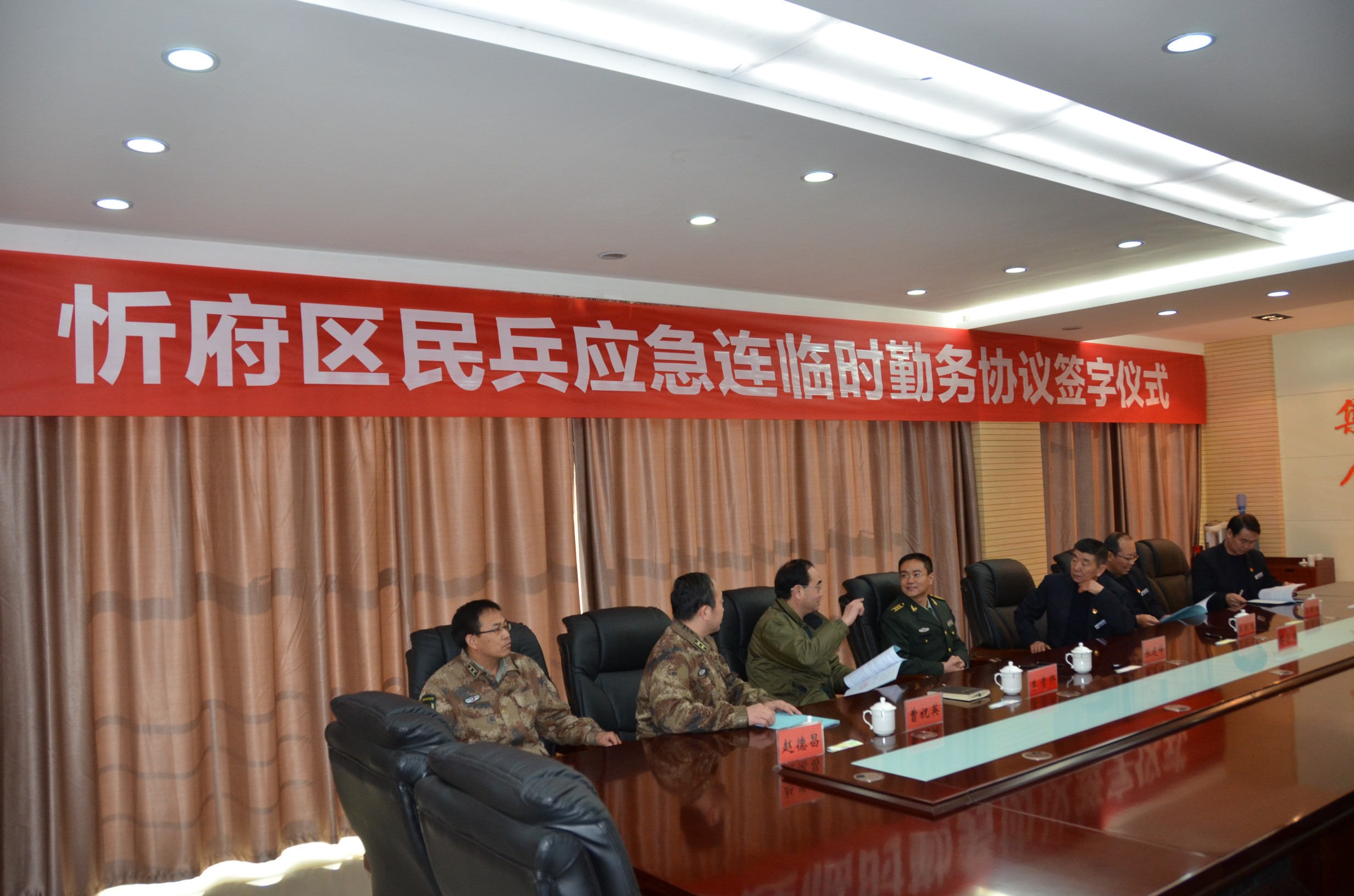 忻府區(qū)人民武裝部部長張建峰同志召集所屬負(fù)責(zé)人與我公司領(lǐng)導(dǎo)在該部會議室召開忻府區(qū)民兵應(yīng)急連臨時(shí)勤務(wù)協(xié)議簽字儀式。雙方領(lǐng)導(dǎo)暢談軍旅生涯,暢所欲言,對合作開展執(zhí)行勤務(wù)事宜進(jìn)行細(xì)致研究,武裝部領(lǐng)導(dǎo)對我公司的隊(duì)伍建設(shè)作風(fēng)以及企業(yè)服務(wù)精神面貌給與了充分肯定。