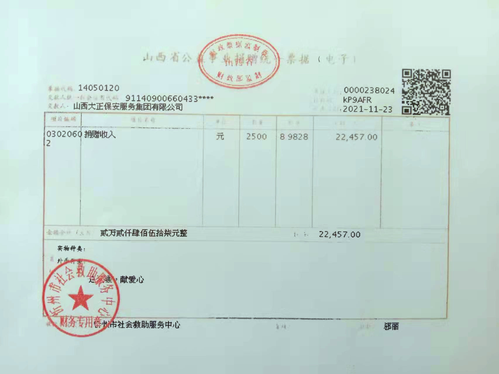 與此同時,公司基層各級黨組織和黨員領(lǐng)導干部充分發(fā)揮表率作用,帶頭宣傳動員,帶頭捐款獻愛心,以實際行動影響和帶動廣大干部職工在各所屬駐地相繼踴躍開展、參與了捐助活動。一筆筆捐款,代表著山西大正保安集團廣大職工的一份份愛心,詮釋著大正保安人對社會的拳拳愛心,短短幾天時間,我公司共收到員工社會捐款22457元。