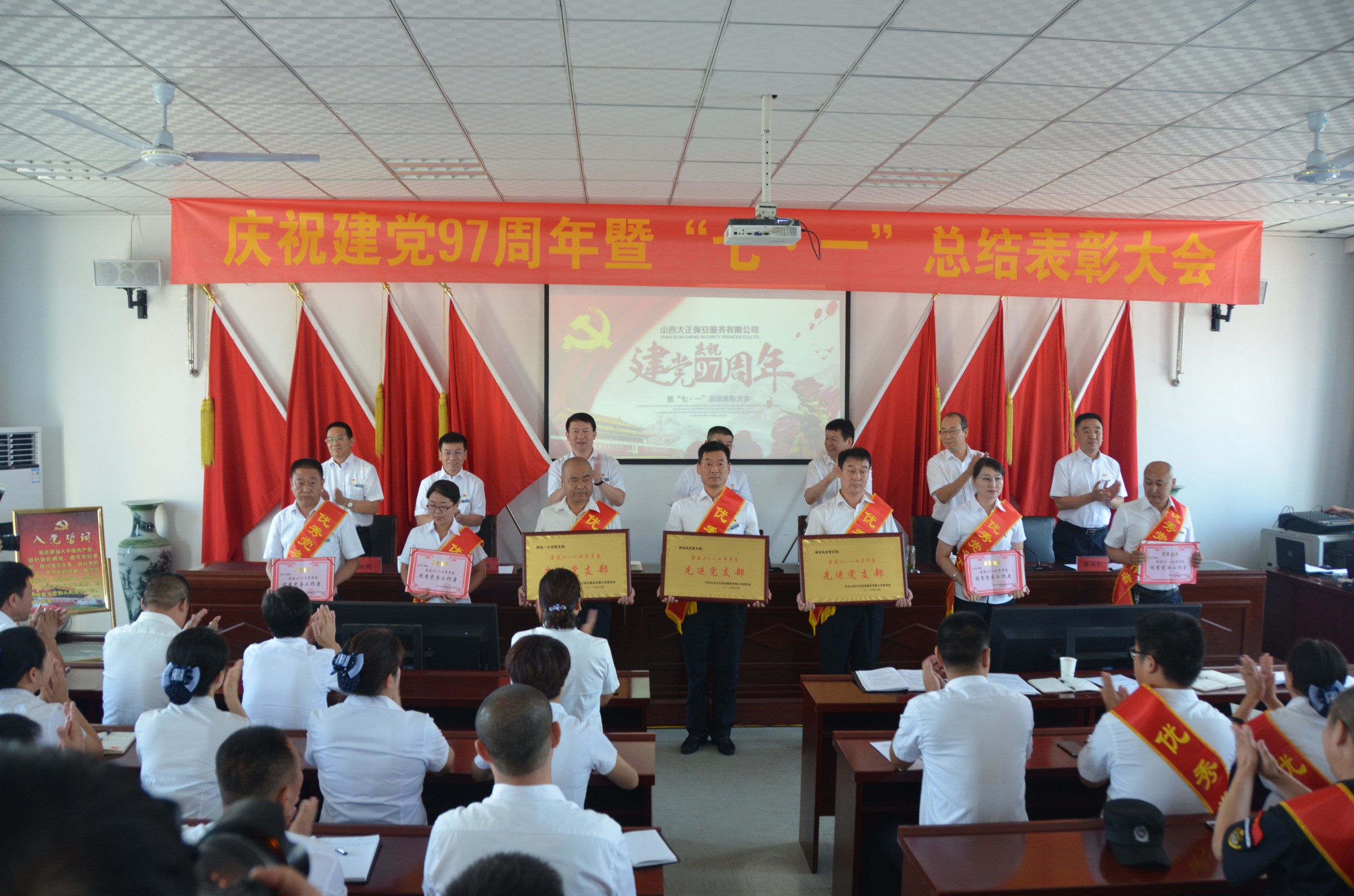 為慶祝建黨97周年,回顧總結(jié)公司一年來黨建及其它各項(xiàng)工作取得的新進(jìn)展、新突破、新成果,安排部署下一階段黨建及其它各項(xiàng)工作,6月30日上午9時(shí),山西大正保安服務(wù)有限公司在總公司會(huì)議室隆重召開了“慶祝建黨97周年暨“七·一”總結(jié)表彰大會(huì)”?偣靖鞑块T、各分公司、各縣、市、區(qū)基層中隊(duì)分別在主會(huì)場(chǎng)、分會(huì)場(chǎng)收聽、收看了大會(huì)實(shí)況。出席大會(huì)的領(lǐng)導(dǎo)有張躍生、陳志平、趙培宏、王雙明、邢春生、張瑞東、呂雙明,大會(huì)由王明生同志主持。