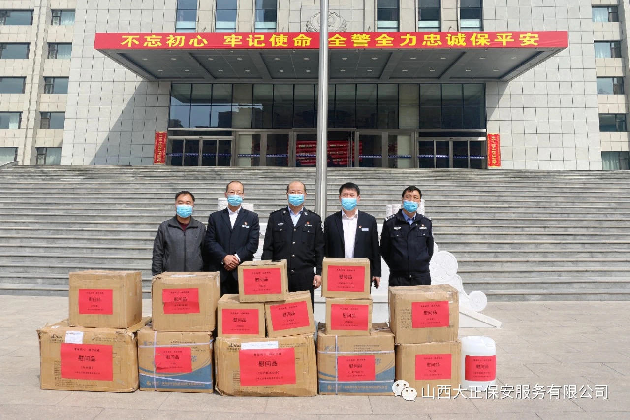 3月31日,山西大正保安服務(wù)(集團(tuán))有限公司黨委委員、副總經(jīng)理趙培宏、副總經(jīng)理王明生領(lǐng)導(dǎo)一行,專程來到市公安局,捐贈了醫(yī)用口罩12000、防護(hù)服200套、護(hù)目鏡500個、消毒液80㎏、醫(yī)用酒精25㎏,表達(dá)公司和干部職工對公安民警疫情防控的支持;對警保同心、聯(lián)手抗疫的信心、決心;對廣大公安民警健康的關(guān)愛。忻州市公安局副局長王雷接過物資后,代表市局對大正集團(tuán)公司的捐贈表示感謝。