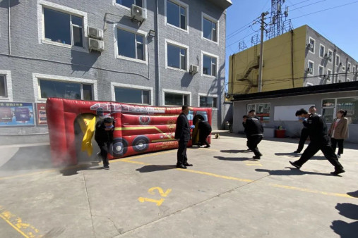 課后,億通公司院內(nèi)搭起了室外逃生氣模帳篷,帳篷內(nèi)放置煙霧器,模擬火災(zāi)現(xiàn)場。50余名職工口捂濕毛巾,依次進入逃生帳篷內(nèi)摸黑逃出。通過實地演練,使員工更加直觀地體驗“火災(zāi)現(xiàn)場”,提高了員工的火場逃生自救能力。